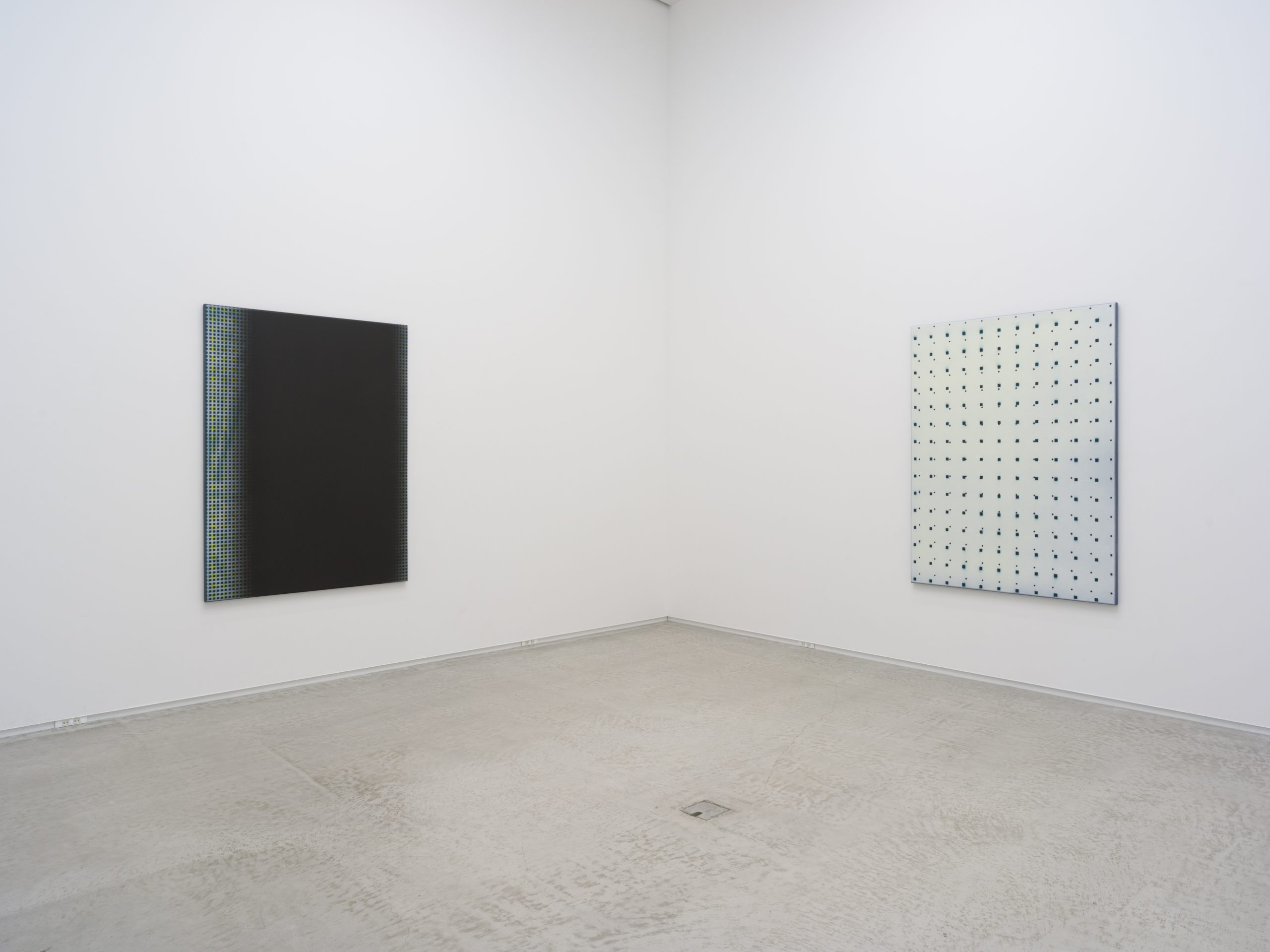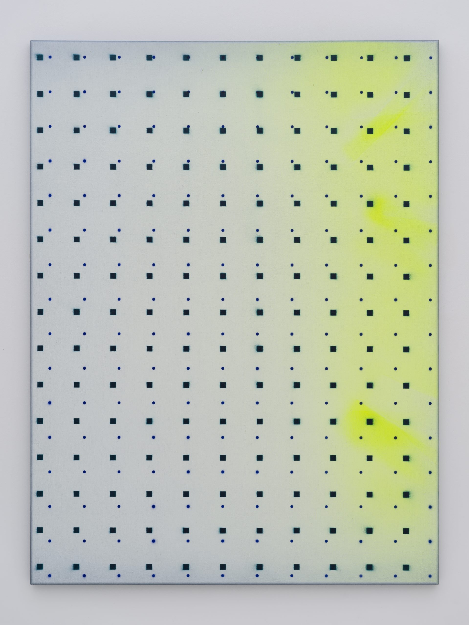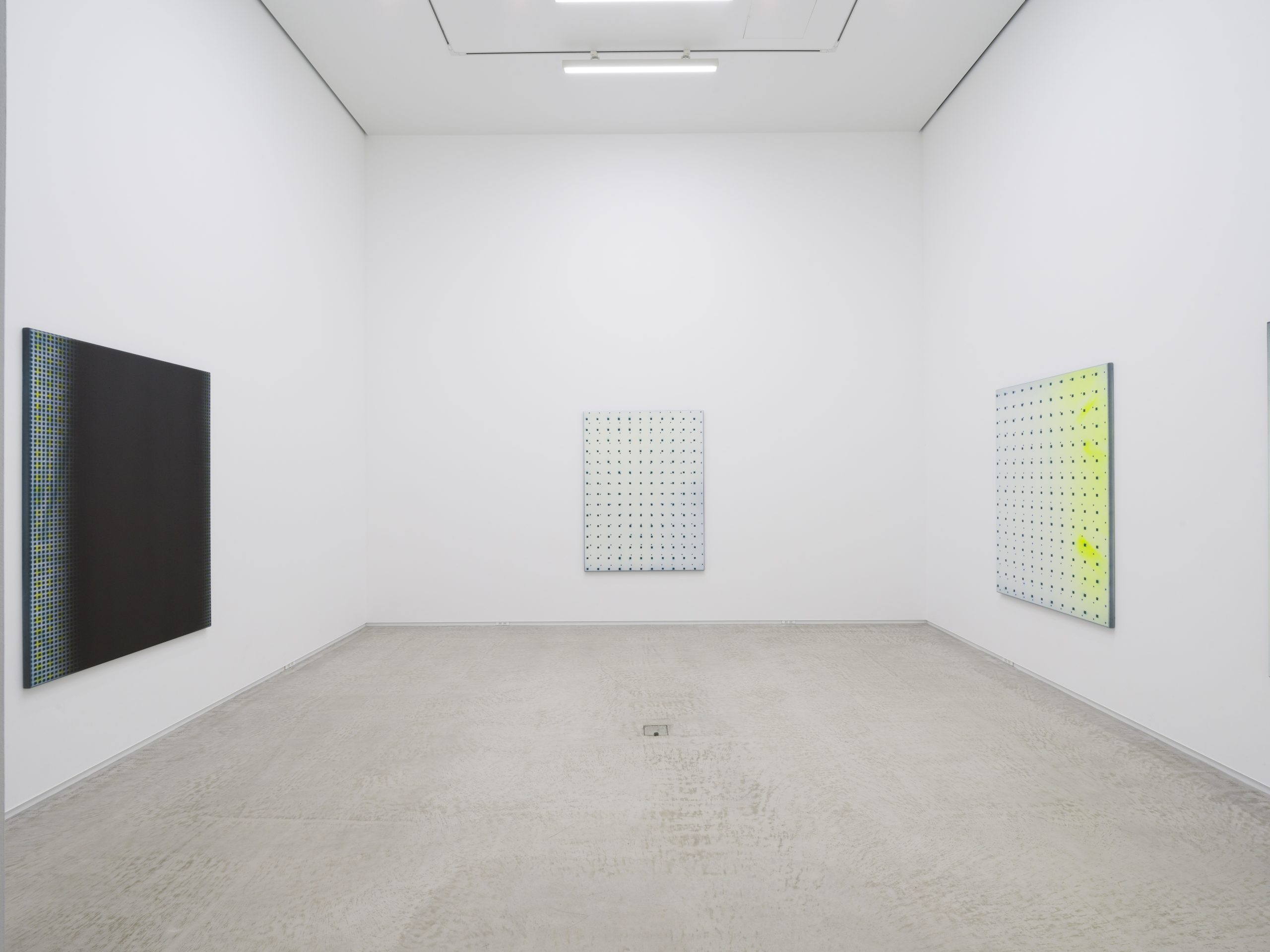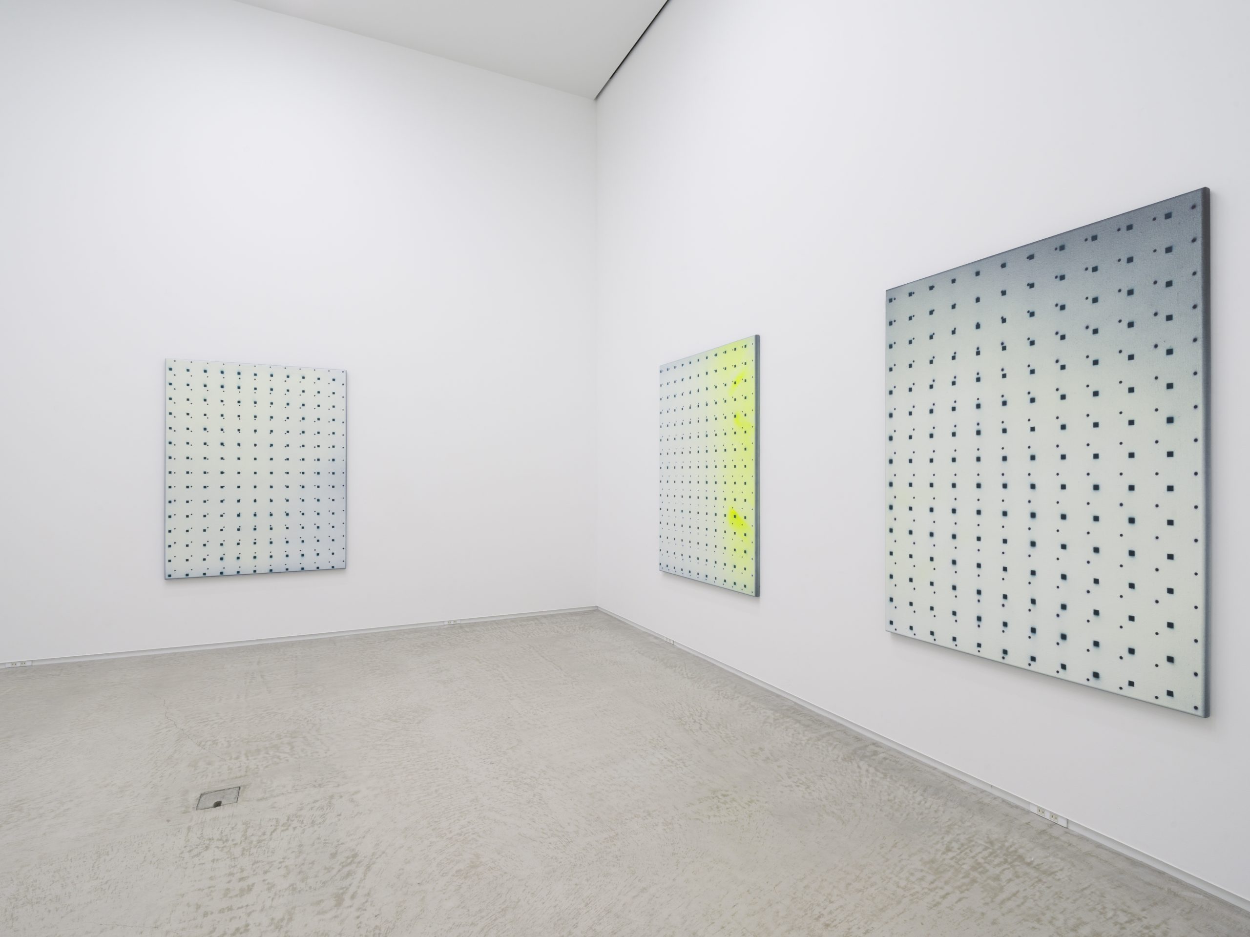 この展覧会にてネイサン・ヒルデンは一連の新作を発表します。これらの作品は彼の初期のキャンバス絵画に深く根ざしています。当時の作品は機械的かつジェスチャー的なプロセスで、スプレーペイントと密に重ねられたライナーステンシルのパターンが用いられたキャンバス絵画でした。現在の作品では、絵画の内部空間が開かれ、反復の要素はグリッド上の点、正方形、円であり、色彩は豊かなニュアンスを持っています。